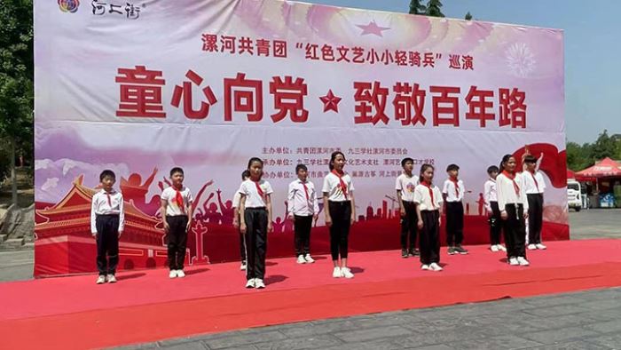 5月1日,为庆祝建党100周年,由共青团漯河市委、九三学社漯河市委员会主办,九三学社漯河市文化艺术支社、漯河艺多多口才学校承办,漯河曲艺家协会、河上街景区协办的漯河共青团“红色文艺小小轻骑兵”巡演在河上街受降亭举行。团市委副书记陈增、团市委副书记、漯河市青年志愿者协会副会长李薛童出席会议。共青团红色文艺轻骑兵轮值团长、九三学社漯河市文化艺术支社秘书长、漯河市曲艺家协会副主席蔡朝君及九三学社漯河市文化艺术支社部分社员参加此次活动。